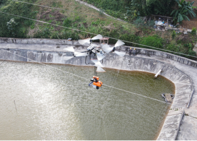 11月17日,国网重庆市区供电公司首次采用“无人机+涂覆机器人”联合作业方式,对10千伏线路开展带电喷涂绝缘漆工作,为跨鱼塘的裸导线披上“绝缘防护外衣”,有效提升鱼塘线下垂钓风险防控能力,全面保障群众人身安全和电网安全。